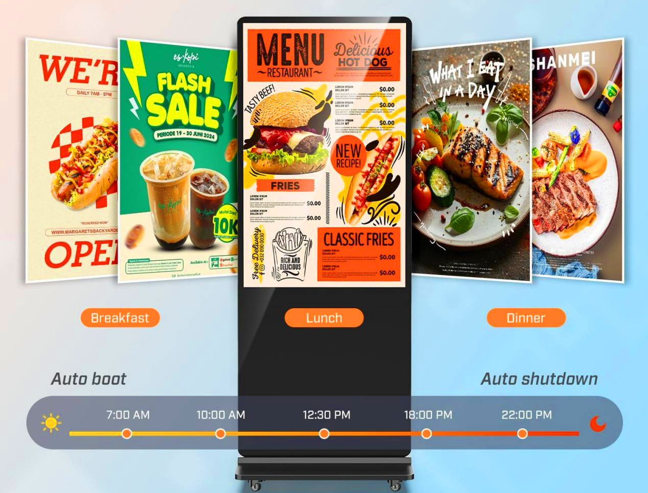 A restaurant can show breakfast specials in the morning, lunch deals in the afternoon, and dinner promotions in the evening—all without manual changes.